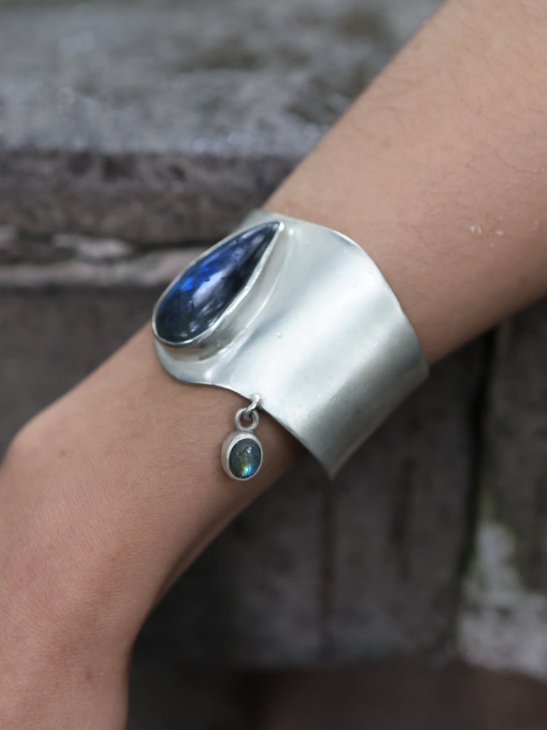 inspired by the power of a storm, each cuff is hand-forged from luminous 980 silver and set with natural labradorite that flashes electric blue in shifting light. each stone is individually selected for its unique character